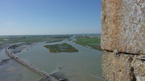 Dans la baie du Mont-Saint-Michel, lors des grandes marées, en se retirant, la mer découvre jusqu’à 25 000 ha de sable, de tangue, d’herbus et de rivières. Le marnage (différence de hauteurs entre haute et basse mer) peut atteindre 14 m en période de forts coefficients. La mer monte (c’est le flot) en un peu moins de 6 h et descend (c’est le jusant) en un peu plus de 6 h à une vitesse pouvant atteindre 10 km/ h . Tenez-en compte : le danger est réel !!!