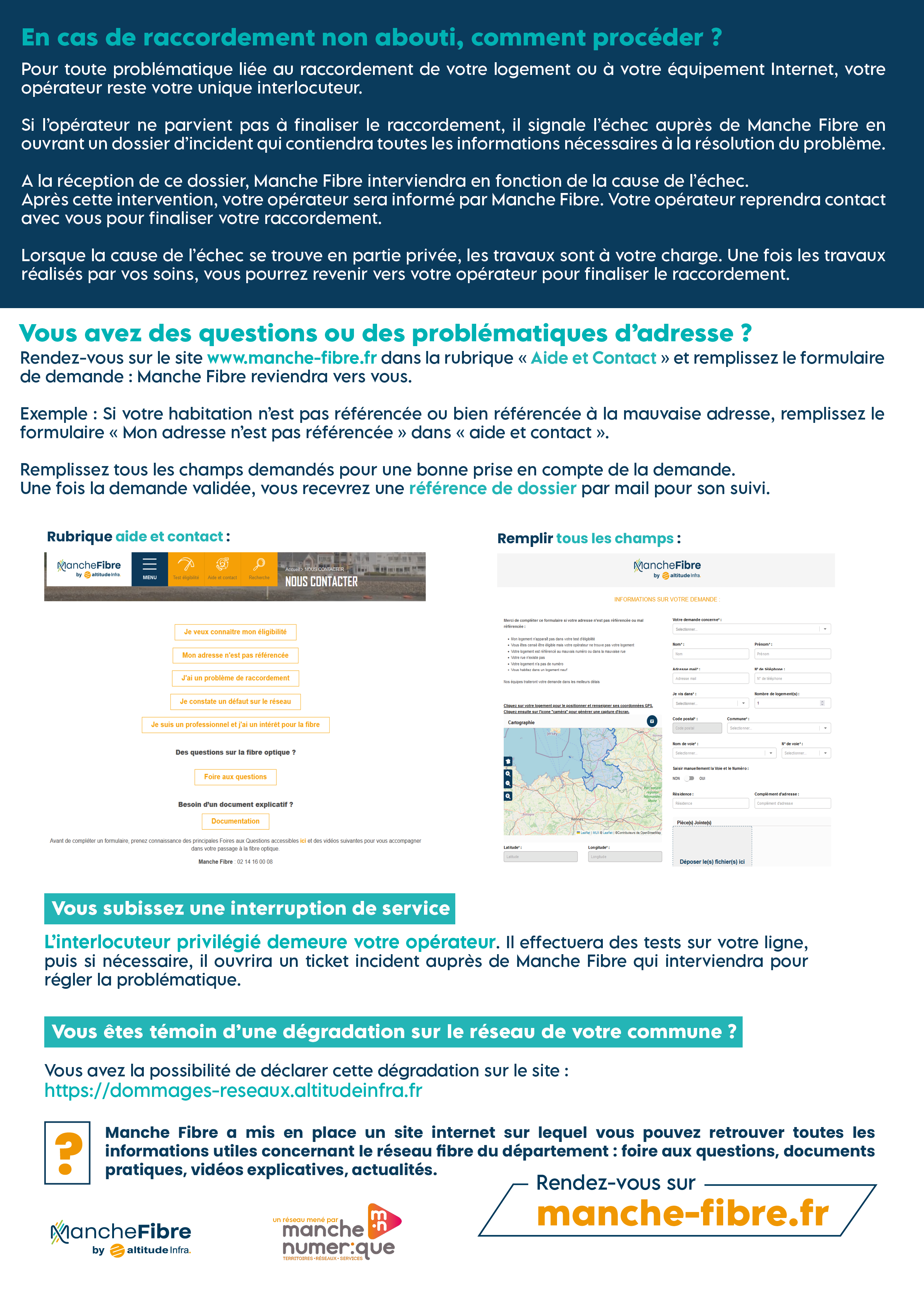Soucieuse de vous accompagner au mieux dans le cadre de l'installation de la fibre optique chez les particuliers, Manche Fibre, exploitant du réseau fibre optique manchois vous propose de se renseigner directement auprès de ses services.
