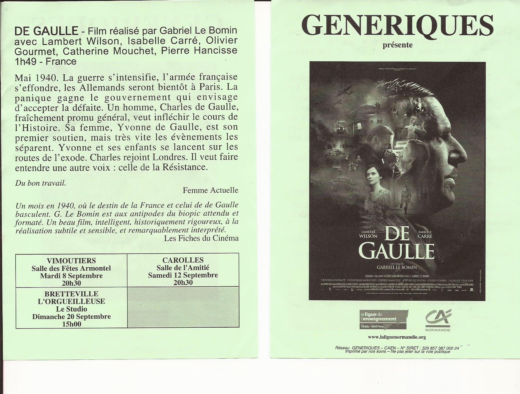 Reprise des projections à Carolles : GENERIQUES et CAROL’in vous présente le film "DE GAULLE". le samedi 12 septembre, à 20h30.