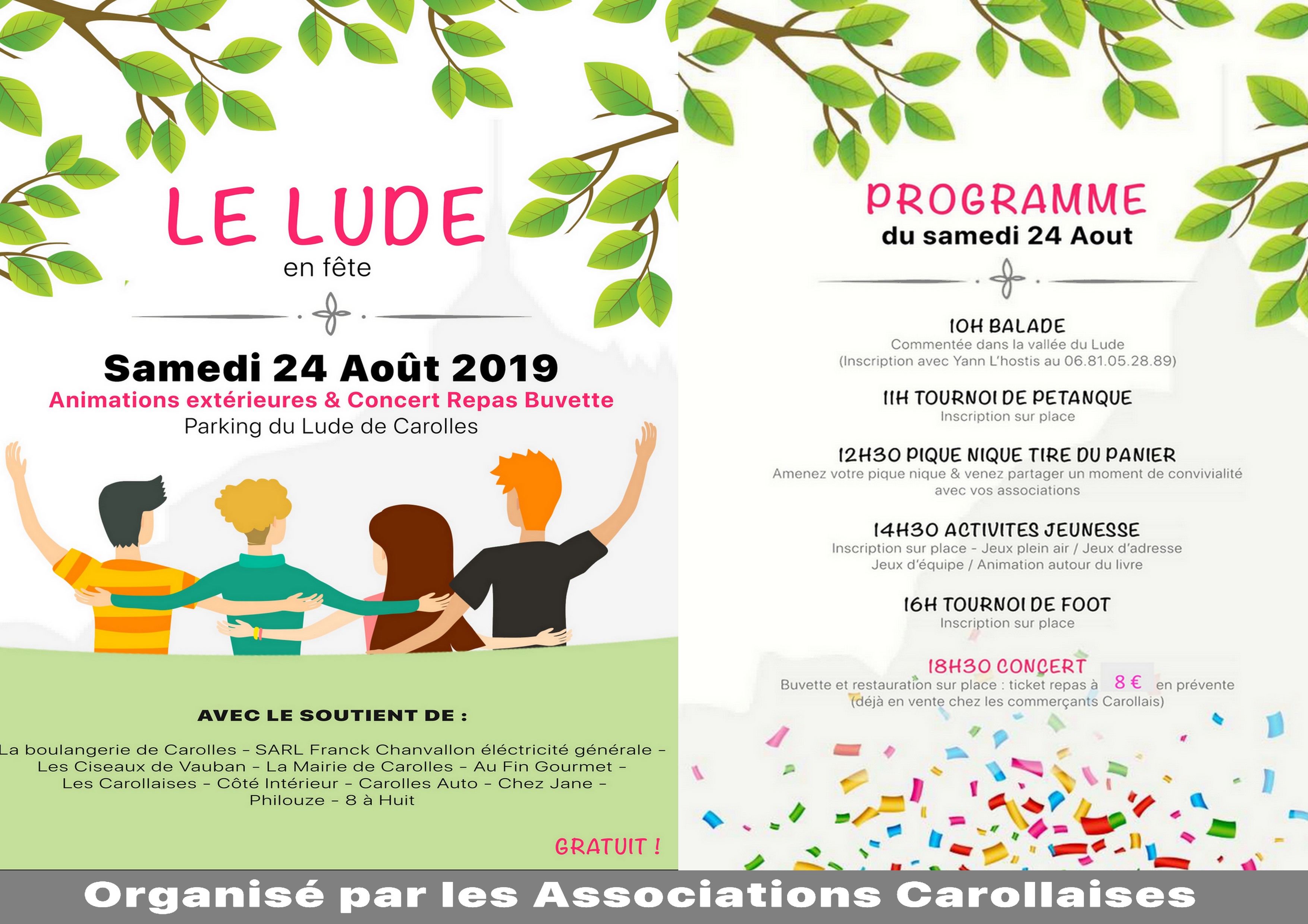 Gratuit, ticket repas / 8 €, en prévente chez les commerçants de Carolles. Organisateur : les associations carollaises. Voir le programme en pièce jointe. |