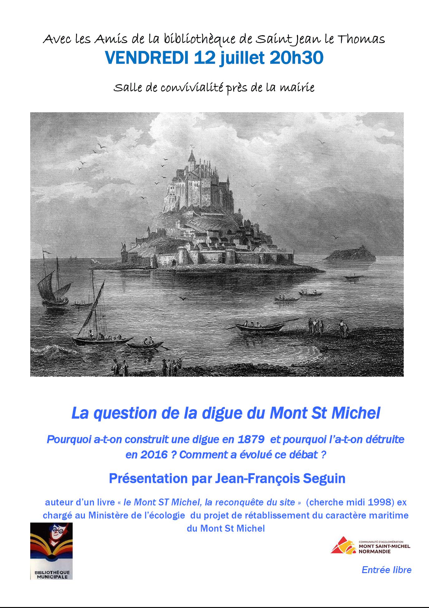 Les Amis de la Bibliothèque de Saint Jean le Thomas vous invitent à une causerie sur le thème : "La question de la digue du Mt St Michel", qui sera animée par Jean-François Seguin, auteur d’un livre « le Mont St Michel, la reconquête du site » (cherche midi 1998) et ex-chargé au Ministère de l’écologie du projet de rétablissement du caractère maritime du Mont St Michel.