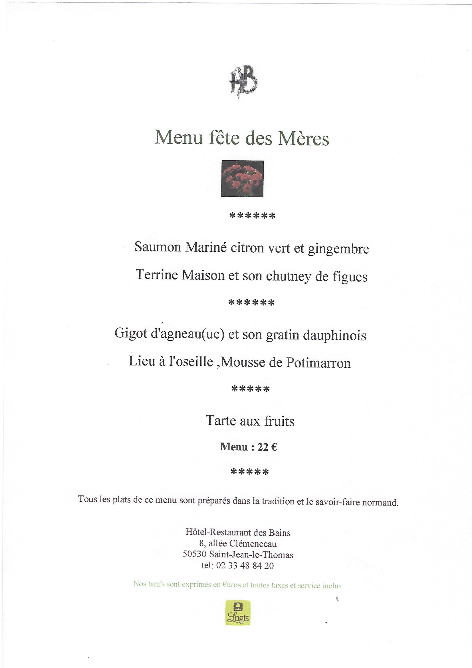 Le 26 mai, le restaurant des Bains propose un menu spécial "fête des mères" à 22 €, préparé dans la tradition et le savoir-faire normand.