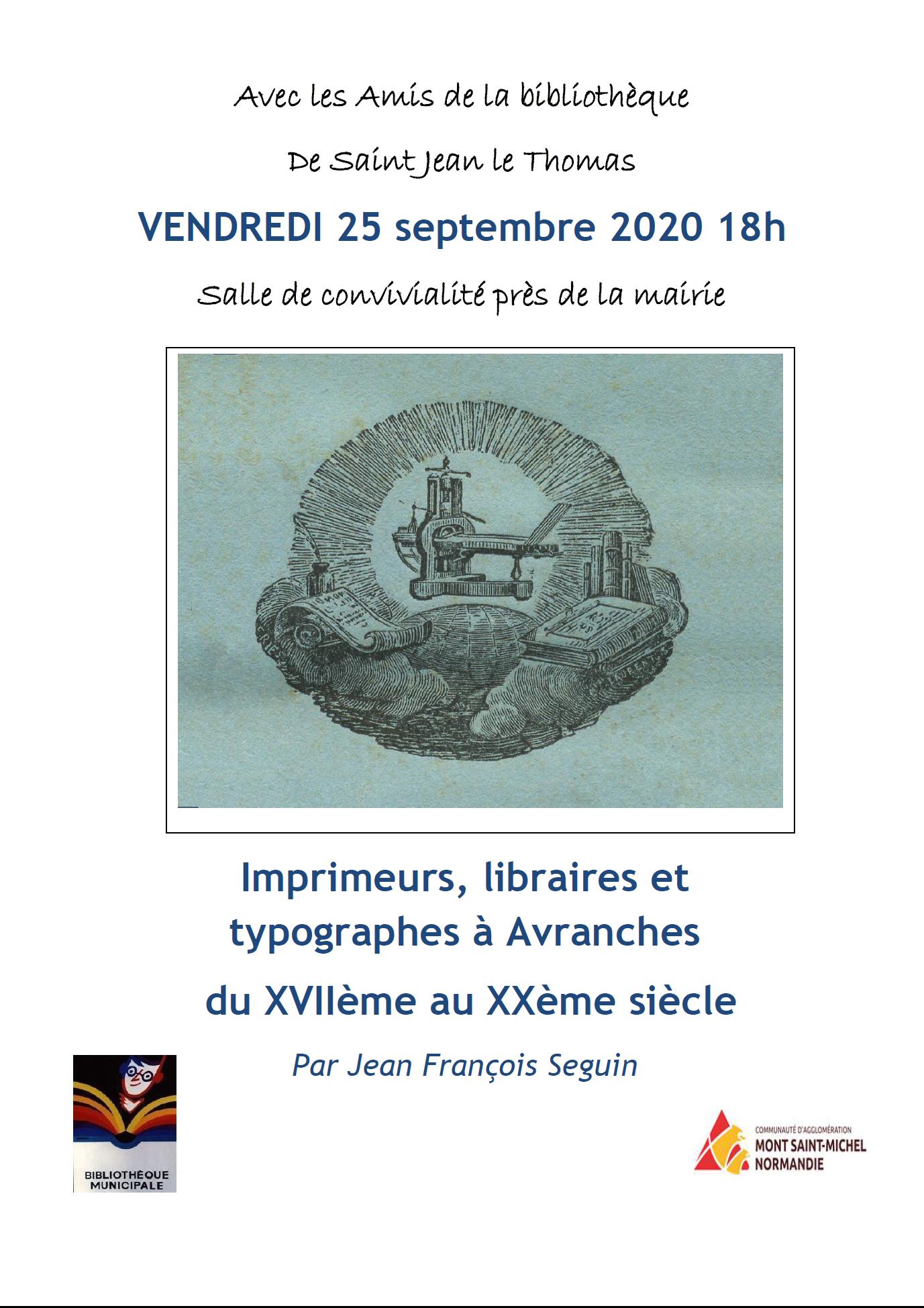 A l'invitation des Amis de la Bibliothèque, Jean François Séguin, féru de l'histoire de l' Avranchin "causera" des imprimeurs, libraires et typographes qui ont exercé leur métier à Avranches de 1600 à 1900.