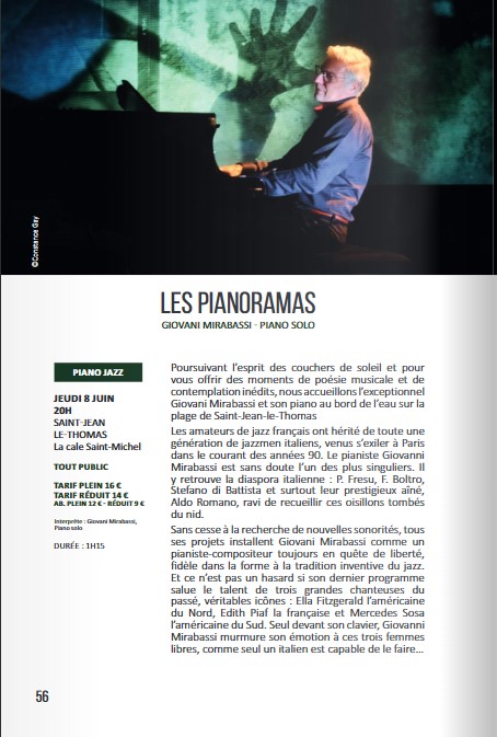 Giovani Mirabassi pianiste compositeur italien vous offrira quelques moments de poésie musicale au soleil couchant.