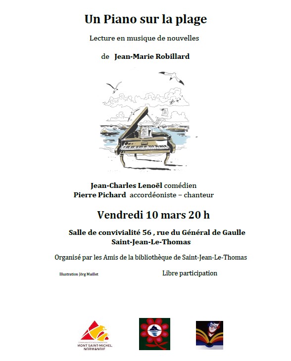 "L’instituteur Jean-François Robillard a d’abord écrit près de vingt ouvrages pour la littérature jeunesse dont certains ont été primés , suivis de son roman adulte « Un jour… Une île » . Son dernier projet fut " Un piano sur la plage " un recueil de huit nouvelles sur le thème de la musique, à l’intention de ses enfants et petits enfants. Il sera publié après sa disparition soudaine en 2021, par son épouse, avec l’aide de ses amis de Jazz sous les pommiers, dont il était un des piliers. Trois de ces nouvelles seront interprétées par le comédien Jean-Charles Lenoël et le musicien chanteur Pierre Pichard." Libre participation Consulter l'affiche en PJ. |