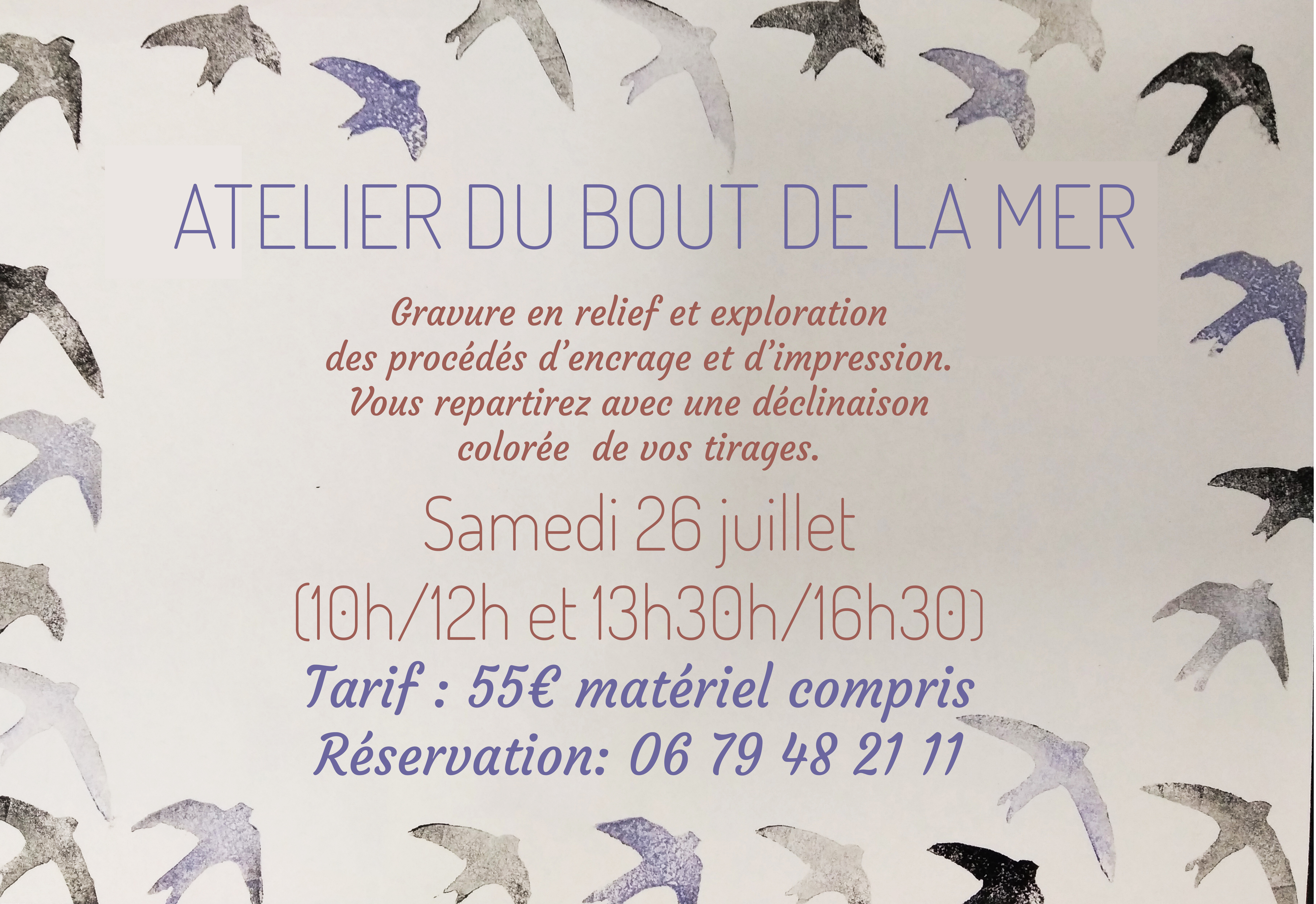 Vous repartirez avec une déclinaison colorée de vos tirages. Durée : 10h/12h & 13h30/16h30 Tarif : 55€ (matériel fourni). Réservation : 06 79 48 21 11. |